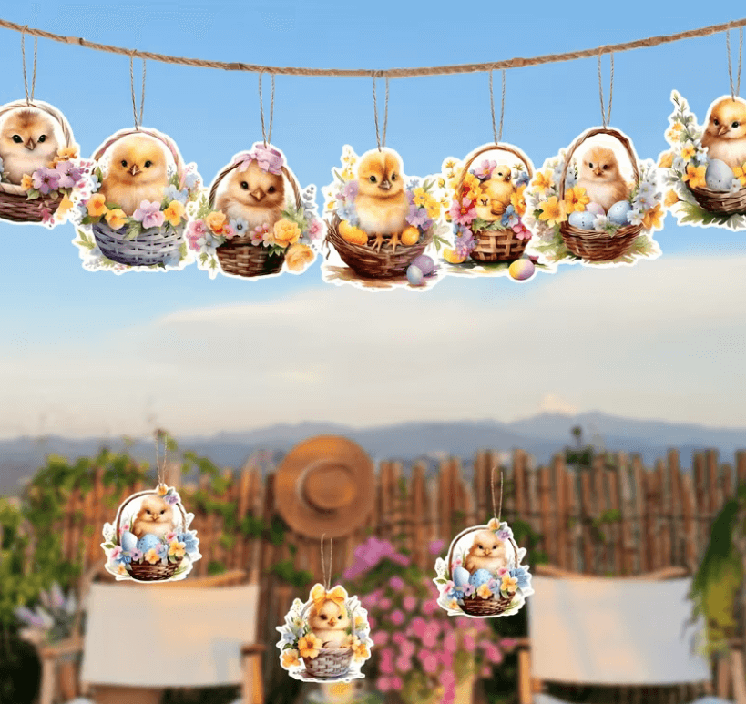 Osterdekoration – Lustige Holzanhänger Küken im Korb Strauchbehang