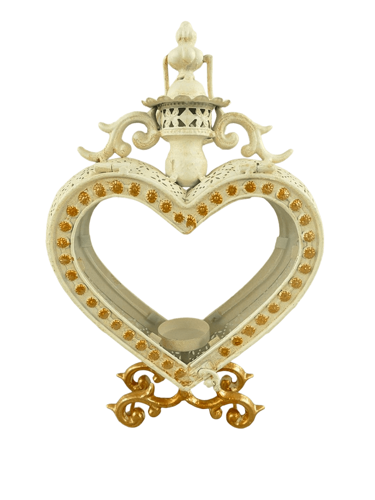 Kunstvoll verzierte Metall-Laterne mit Herzrahmen, goldenen Blumen und Teelichthalter – festliche Deko mit romantischem Flair.