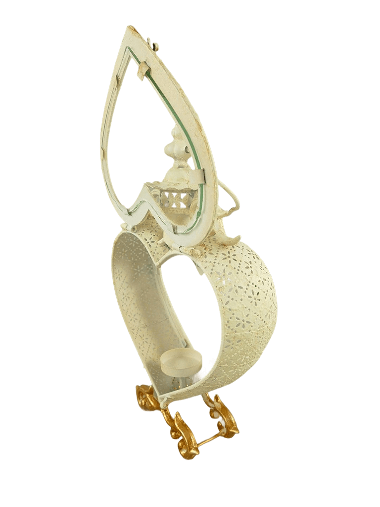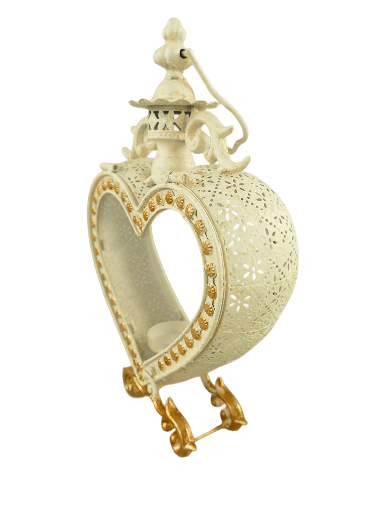 Preview: Dekorative Herz-Laterne aus weiß lackiertem Metall mit goldfarbenen Ornamenten – geeignet für Teelicht, Kerze oder LED, romantische Weihnachtsdeko.
