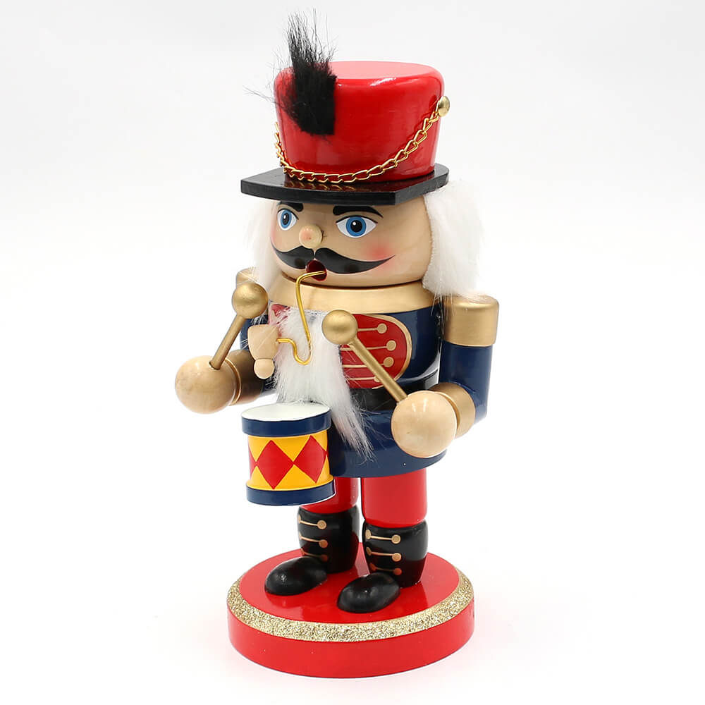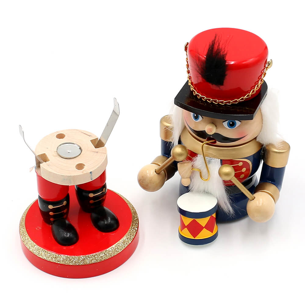 „Dekorativer Holz-Nussknacker mit Trommel und Räucherfunktion, bemalt in Rot, Blau und Gold.“