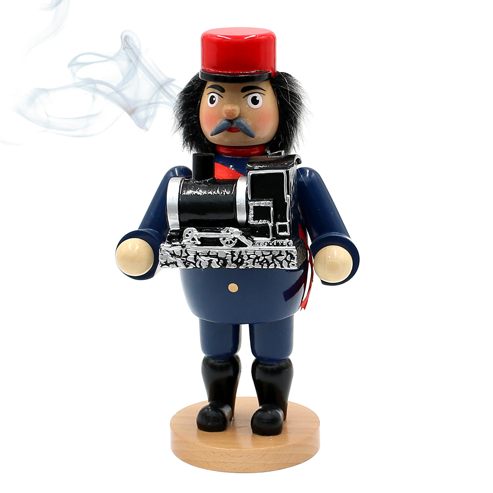 Mobile Preview: Holz-Räucherfigur „Eisenbahner/Lokführer“ mit rauchender Lok, handbemalt und dekorativ – perfekt für Sammler, Modellbahnfreunde und Weihnachtsdeko.